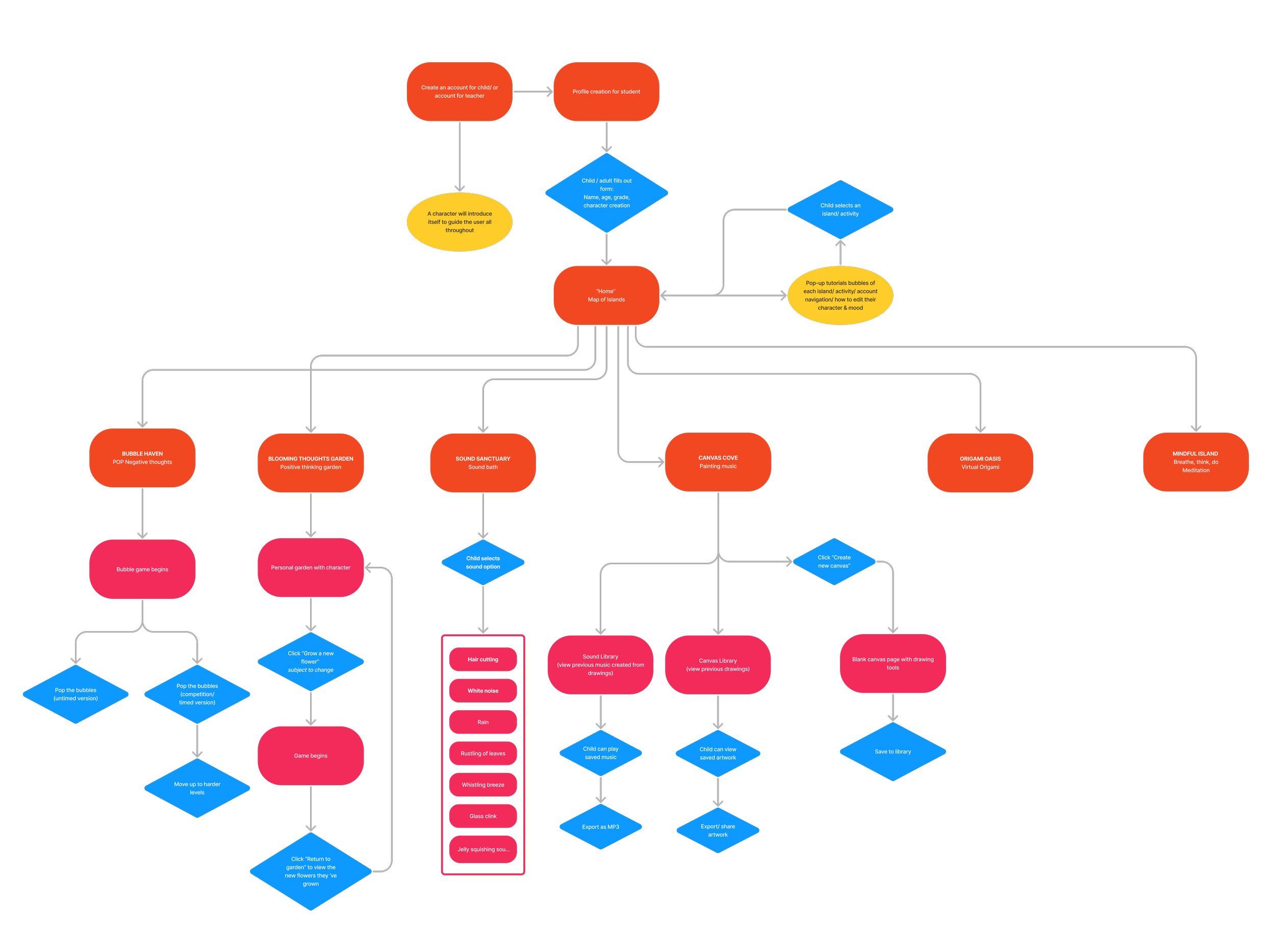 The above user flow is focused on the navigation inside the digital tablet, from the sign up pages to the home page which has various activities and the features inside each activity. Key activities include creating music by drawing, sound bath, popping bubbles, origami, writing negative thoughts, growing plants and interacting with a buddy.